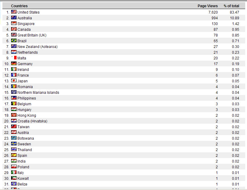 May 1 - April 06 views by country. Hi everybody. Always a little freaky. Apparently we're very popular in the Northern Mariana Islands. Feel free to say hi!